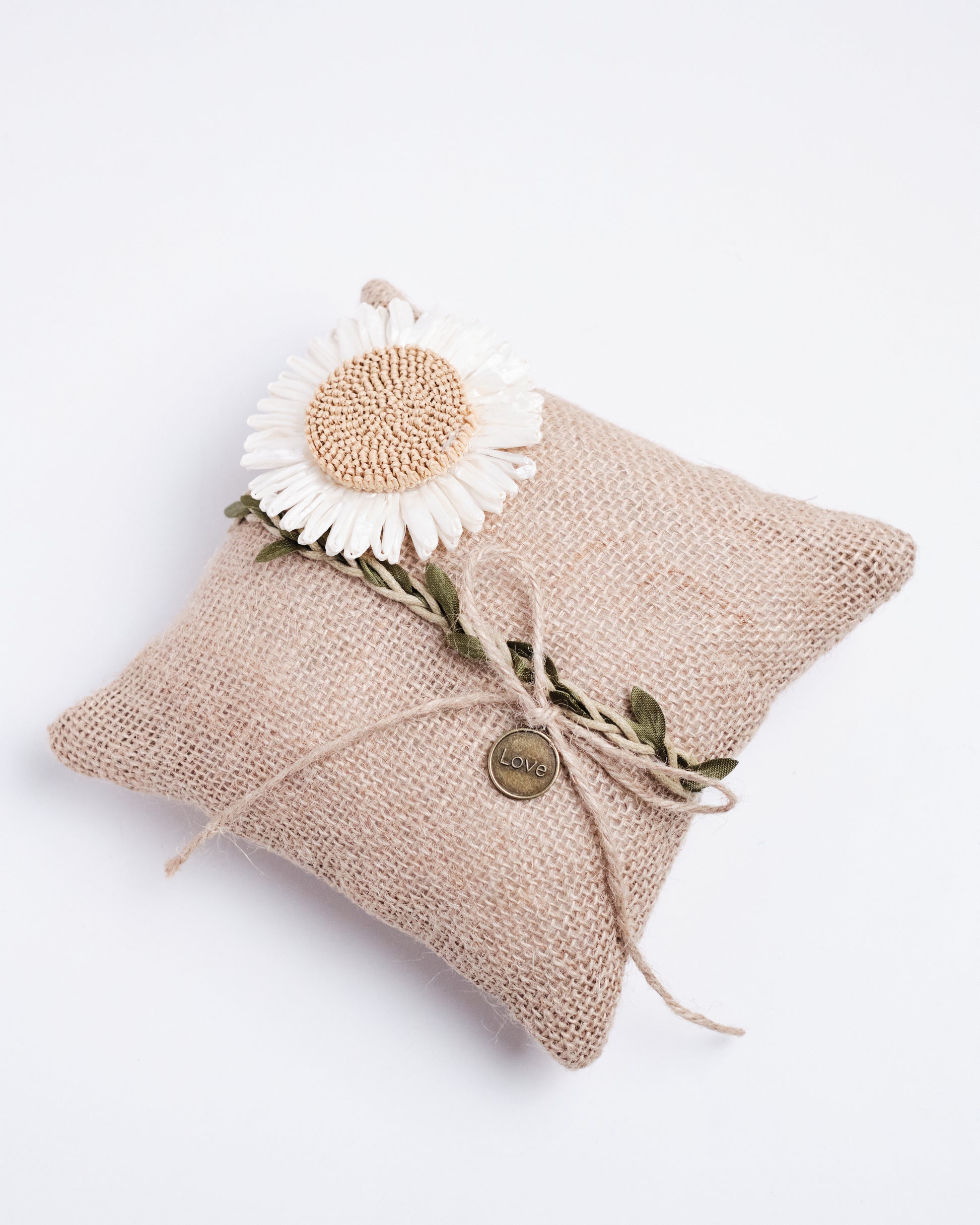 Design: Burlap-style pillow with sunflower centerpiece and ribbon tie